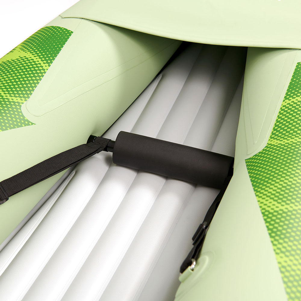 | La protezione dalle onde vi proteggerà dagli spruzzi e le maniglie di trasporto in gomma sono ideali per trasportare il vostro kayak gonfiato. |